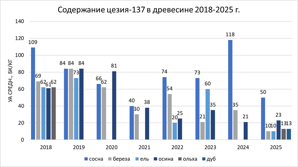 Содержание цезия-137 (среднее) в древесине по породам, 2021-2025 г.